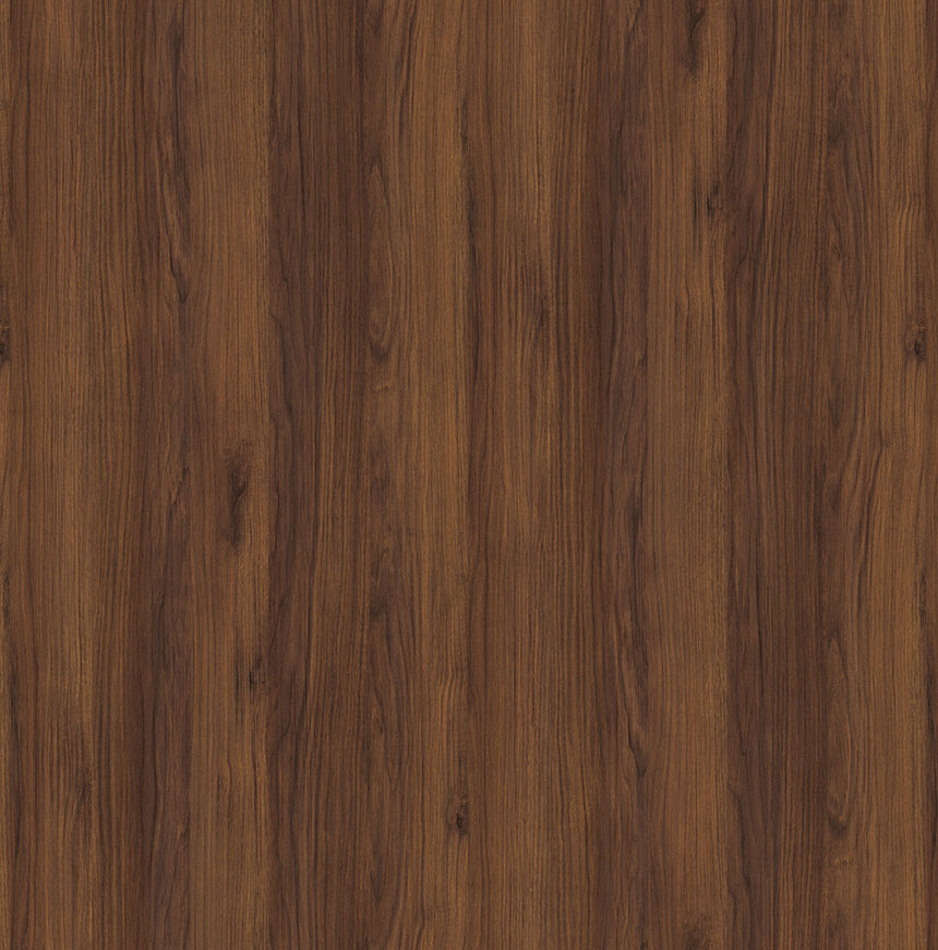 H1307 Ořech Warmia hnědý má teplý hnědý odstín s velmi tmavými prvky a lze jej velmi dobře kombinovat zejména s trendy na téma Černá. Vzor jemných pórů v kombinaci s drobnými rustikálními detaily působí elegantně a přirozeně. To je vizuálně i na dotyk podtrženo matně lesklým charakterem dřeva povrchové struktury ST19 Deepskin Excellent.