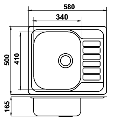Vnější rozměr 50×58 cm a hloubka 16,5 cm. Kuchyňský dřez s přepadem a s odkapovou plochou. Součástí balení je sifon NSP51.