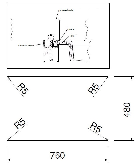 Dřez je standardně určen pouze pro horní montáž, ale lze doobjednat také sadu pro spodní montáž.