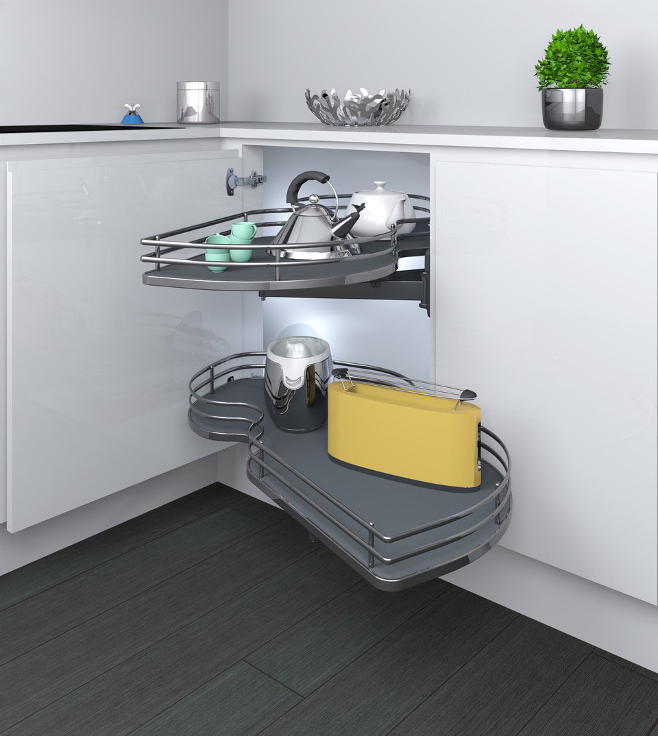 COMBI’S od společnosti INOXA INDUSTRIE je patentovaný systém do rohových skříněk, takzvaný „slepý roh“.