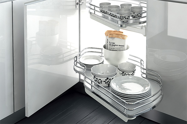 COMBI’S od společnosti INOXA INDUSTRIE je patentovaný systém do rohových skříněk, takzvaný „slepý roh“.
