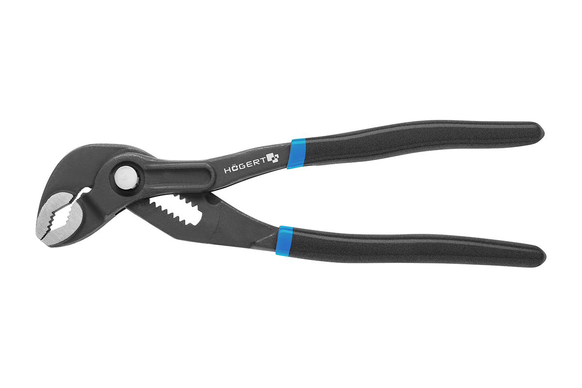 Kleště pro instalatérské a montážní práce. Přesné a rychlé nastavení čelistí stisknutím pružinové pojistky. Rukojeť kleští potažená plastem.