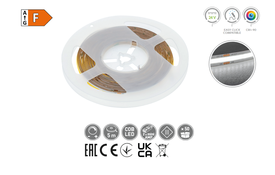 LED pásek 24V 5m COB 480 LED/m, 8mm, studená bílá, 10W/m, 34W/5m, 950 lm/m, mini AMP