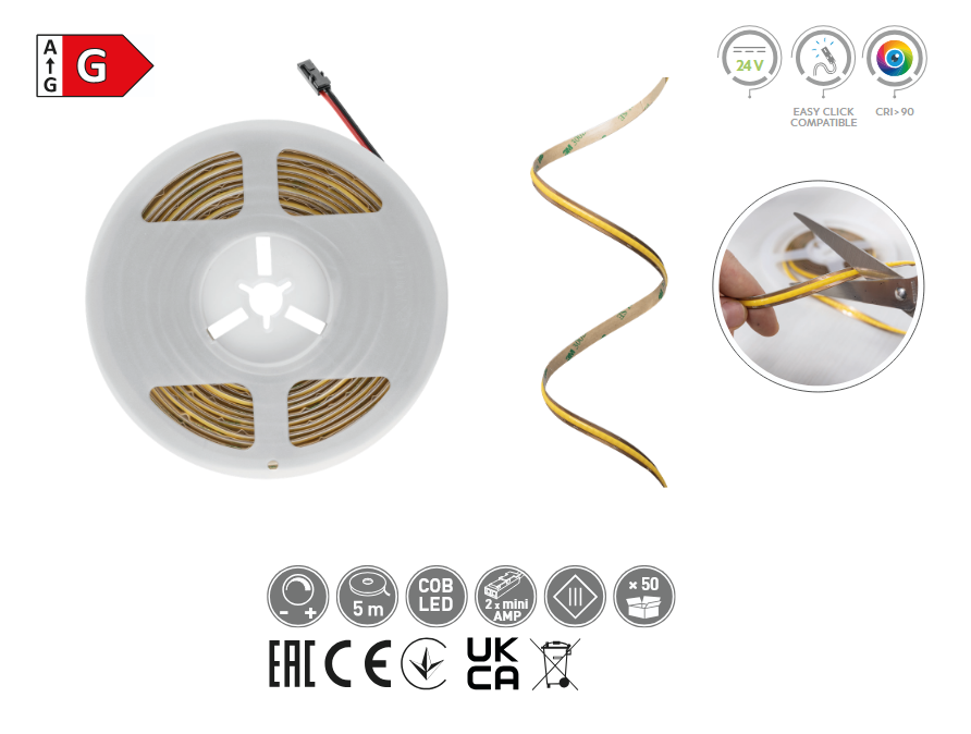 Moderní LED pásek v technologii COB poskytující extrémně rovnoměrné a intenzivní světlo po celé délce, bez viditelných světelných bodů. Ideální pro dekorativní a funkční osvětlení nábytku, výklenků, polic nebo podhledů.
