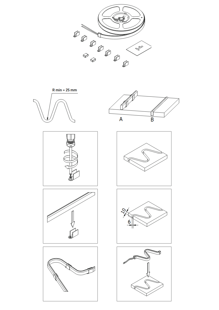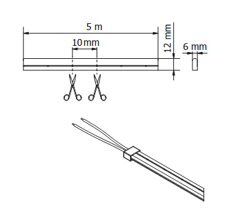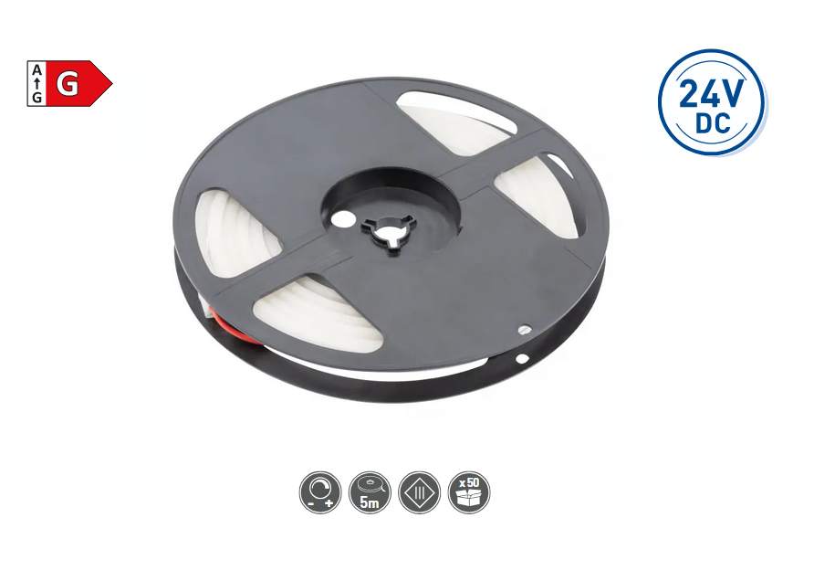 Sada obsahuje 1x 5metrový pásek zakončený na obou stranách napájecím kabelem o délce 15 cm, 2x koncovka (nezbytné pro zkrácení pásky) a 7x montážní spona. Spony a koncovky lze také zakoupit samostatně.