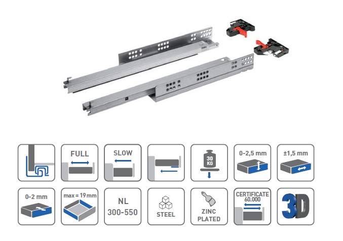 Moderní spodní montážní vedení Slide s mechanismem tichého zavírání. Vyrobeno z oceli potažené zinkovým povlakem pro ochranu proti korozi. Využívá technologii slip-on montáže se spojkou, která nevyžaduje použití nářadí. Spodní montáž se navíc vyznačuje skrytým uchycením ke dnu zásuvky, což umožňuje zachovat vysokou estetiku. Mechanismus tichého zavírání zvyšuje komfort používání, a proto bude systém skvěle fungovat v každodenních místnostech. Plný výsuv umožňuje přístup do celé hloubky zásuvky a seřízení ve 3 rovinách bez použití nářadí usnadní proces montáže a vhodné nastavení posuvu zásuvky. Výrobek najde své univerzální uplatnění pro zásuvky s bočními stěnami z materiálu o tloušťce 16 – 19 mm. Odolnost výrobku je navíc certifikována na 60 000 cyklů a vydrží zatížení až 30 kg.