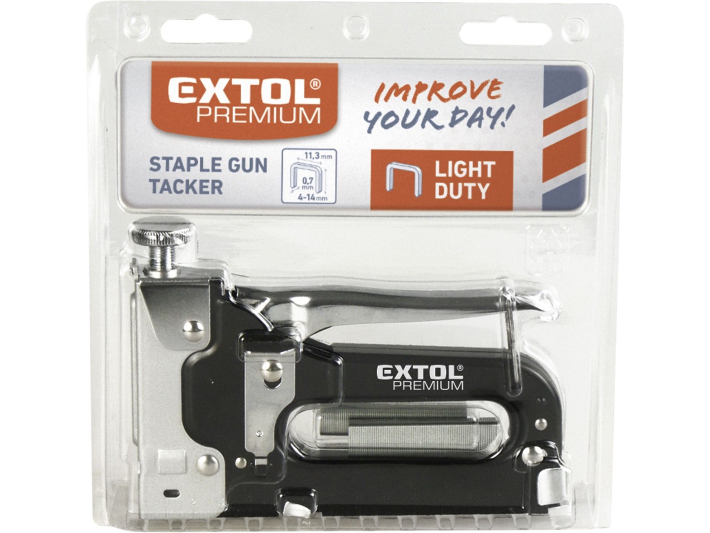 Sponkovačka na dřevo, textil a kůži – ruční, pákový mechanismus, nastavení síly úderu, délka spon 4-14 mm, šířka spon 11,3 mm, hmotnost 0,63 kg