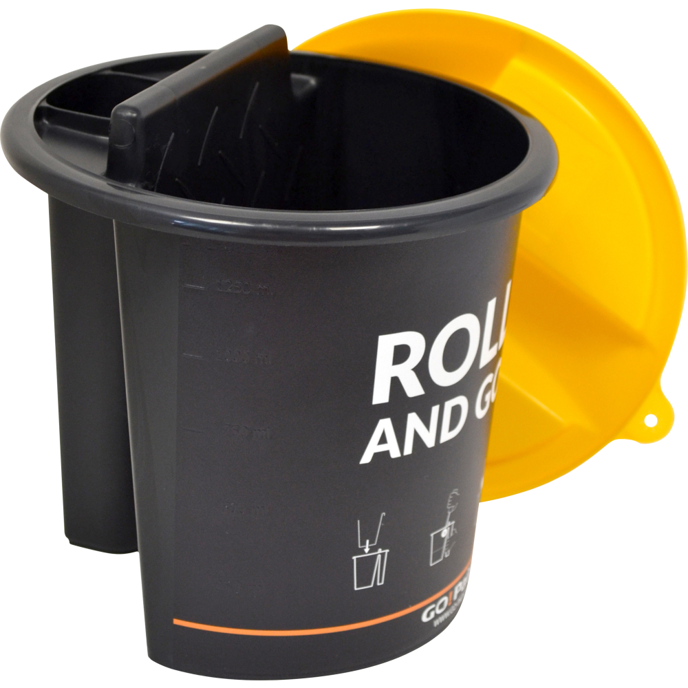 Umělohmotný, měrka objemu, víčko s otvorem na držadlo válečku, držák zároveň slouží jako nádoba na odložení válečku, integrovaná mřížka pro setření barvy.