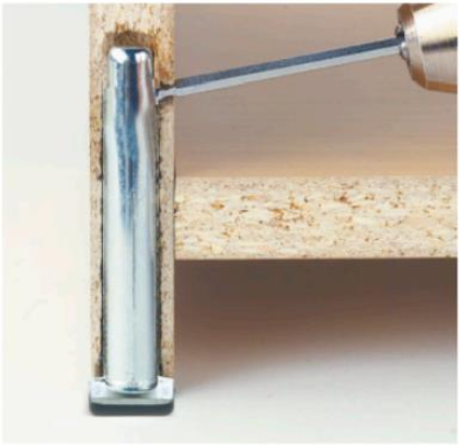 Upevňuje se zavrtáním do boku desky, průměr 12 mm usnadňuje práci s nábytkovými deskami o tloušťce 16 mm a 18 mm.