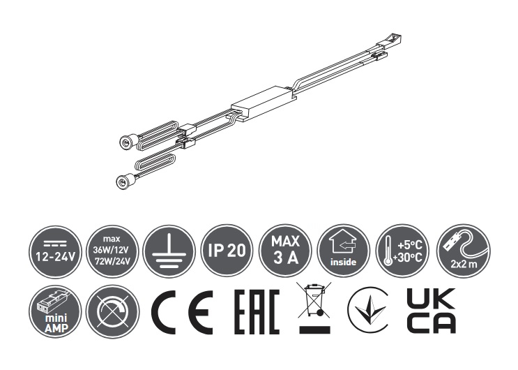 Spínač bezdotykový MICRO IR, 2 senzory, kabely 2m a 1,2m, Černý, 12V/36W,24V/72W,3A mini AMP