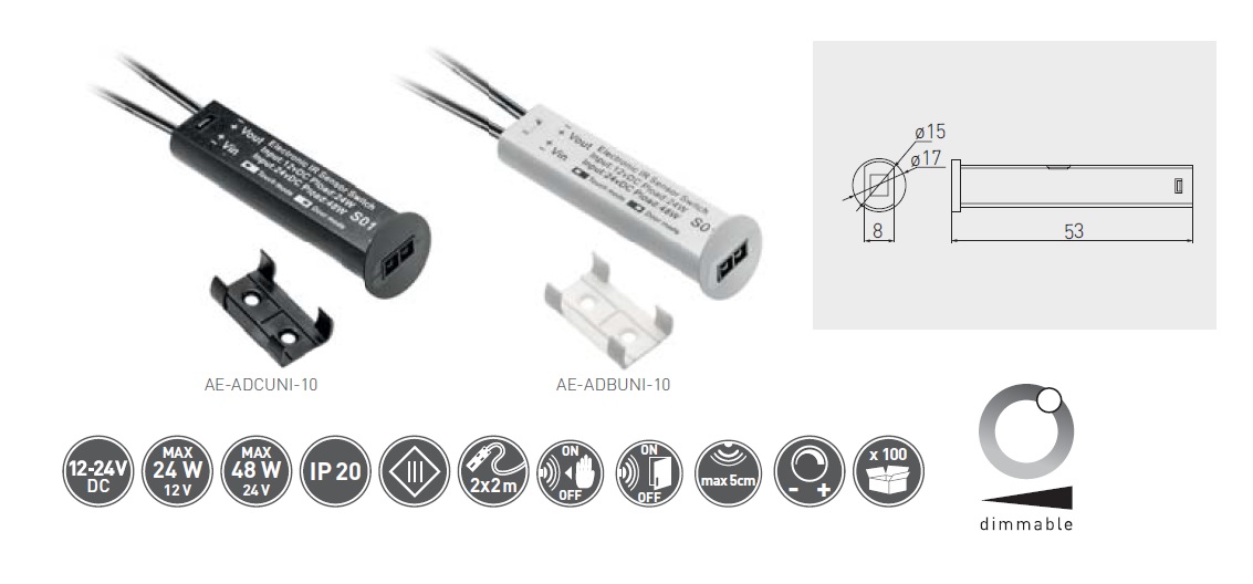 Spínač univerzální bezkontaktní, bílý, 12V/24W, 24V/48W, 2A, stmívatelný, mini AMP