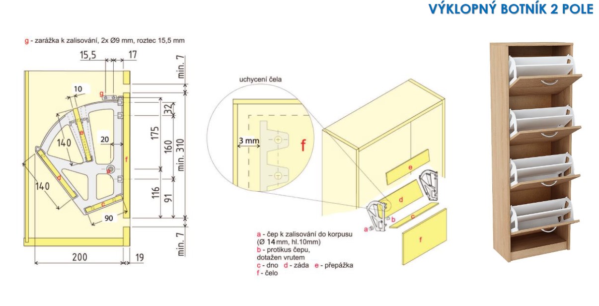 Dovoluje ukládat věci max. délky 240 mm. Pro delší věci je možné zvětšit výšku čela