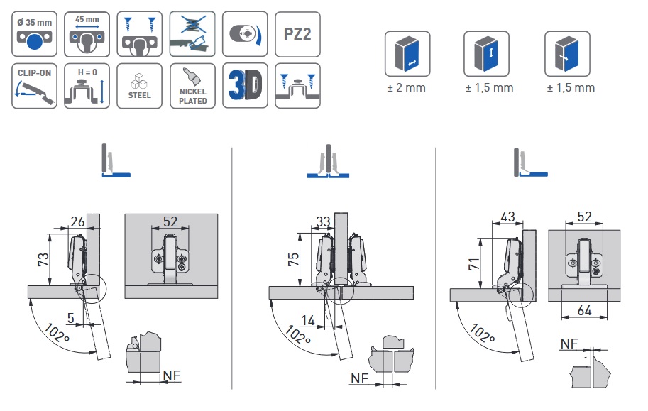 Bezpružinový závěs z rodiny SilentoPRO se vyznačuje mimořádnou odolností a moderním designem. Nejvyšší kvalita zpracování zajišťuje bezproblémový a bezpečný provoz. Výrobek se vyznačuje excentrickým nastavením hloubky, integrovaným v rameni závěsu, a CLIP-ON upevněním podložky, což usnadňuje instalaci. Součástí balení je excentricky nastavitelná podložka, která v kombinaci s nastavením hloubky výrazně usnadňuje nastavení dvířek