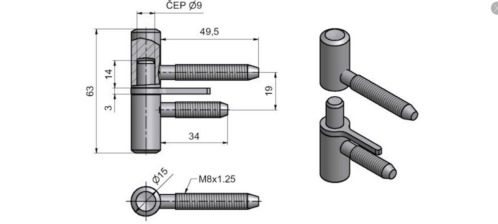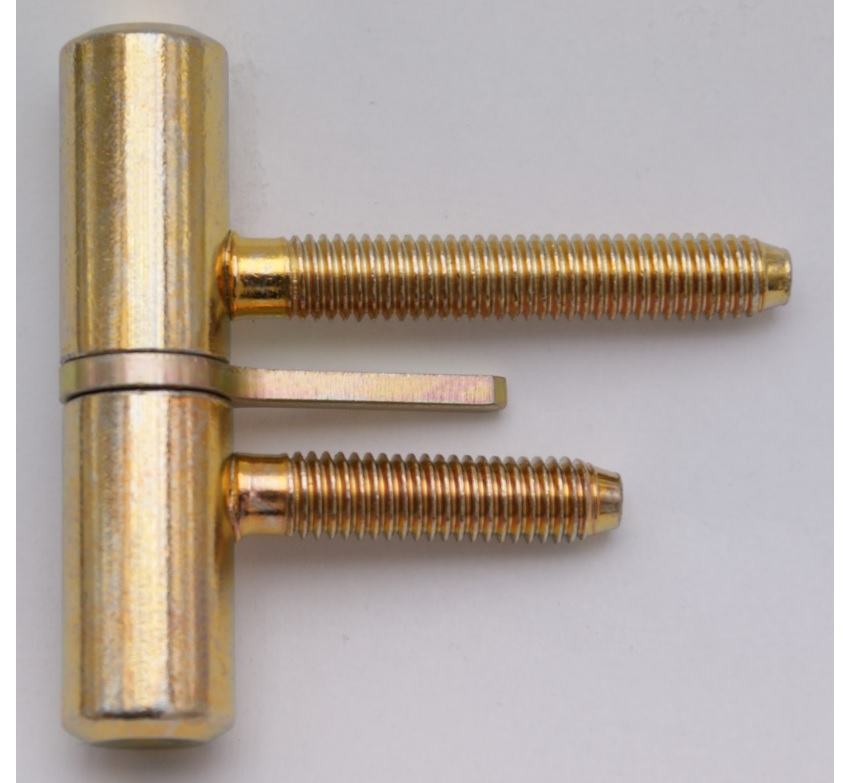 Komplet závěsu určený pro otočné spojení dřevěných dveří s polodrážkou a dřevěné zárubně. Závěs má volně vložený čep.