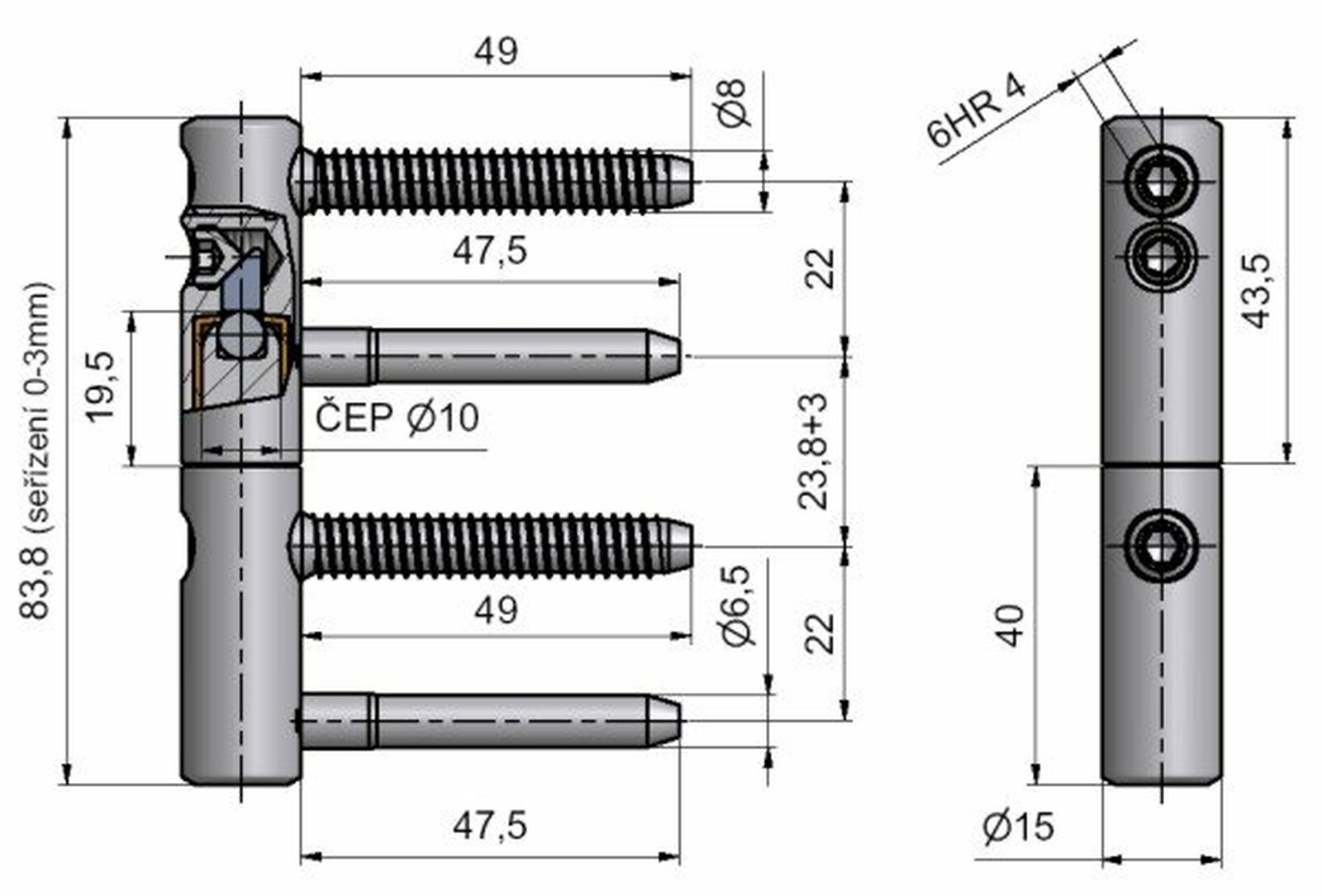 Kompletní dveřní závěs řady TRIO umožňující seřízení dveřního křídla ve třech směrech. Závěs má deklarovanou požární odolnost. Závěs je možno doplnit plastovými nebo kovovými ozdobnými návleky.